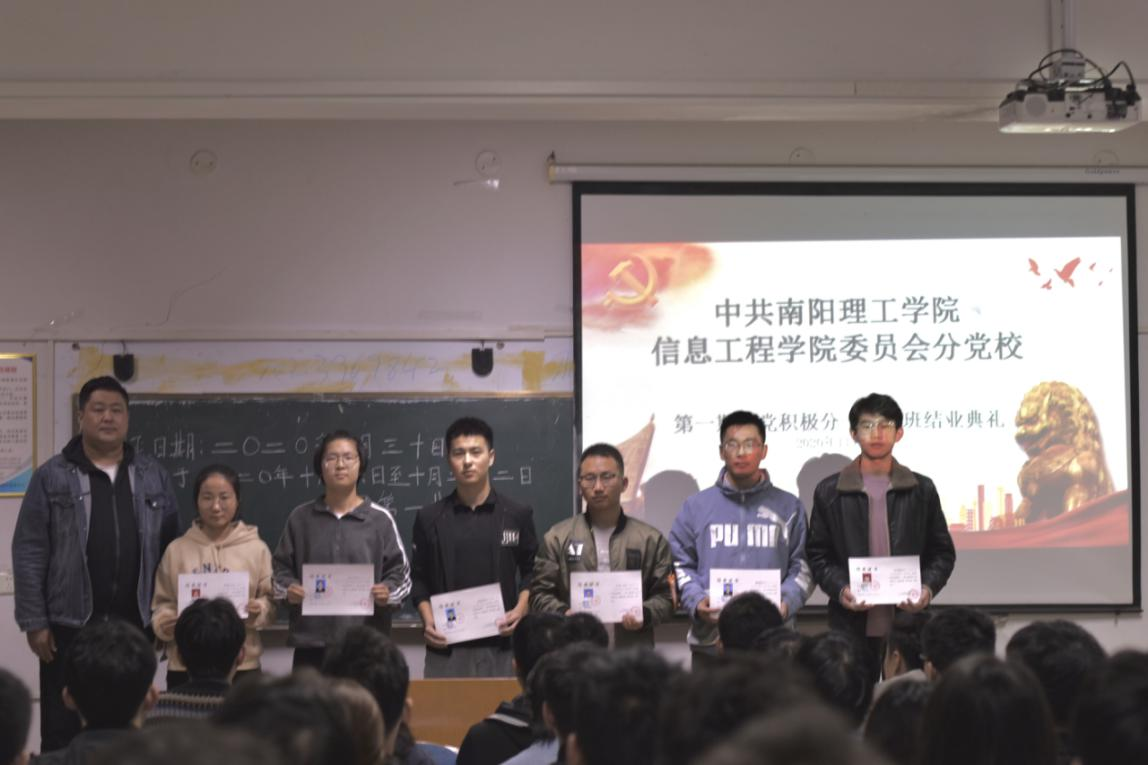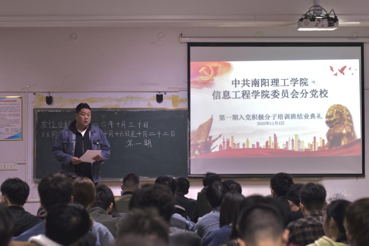本网讯(学生记者/王雪儿、丁奇帅)11月4日晚,我院在12号教学楼505教室举行2020年秋期入党积极分子培训班结业典礼,学生工作办公室主任赵杰出席并主持典礼,本期入党积极分子参加典礼。
