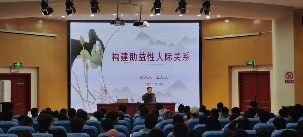 孟凡锐以构建助益性人际关系为切入点,先解读00后大学生的特点表现为独立意识强,个性张扬。从当代大学生人际关系的基本类型总结出学生干部在处理班级学生人际关系时应注意的原则—把握好边界感。他鼓励学生干部在不断提升自身心理素养和工作能力的同时,还要明确自身的角色定位,成为学院和班级各项工作的贡献者,努力维护和谐稳定的学院氛围。
