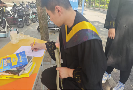 活动当天,志愿者们提前布置场地,热情接待每一位前来捐书的毕业生,他们送来的有专业教材、教辅资料,有知识百科、名著小说……一本本书籍上不仅记载着他们大学期间孜孜以求的奋斗印记,也承载着他们大学四年的青春过往,翻开书本,首页不同字体的寄语传递着对学弟学妹的激励与祝福。