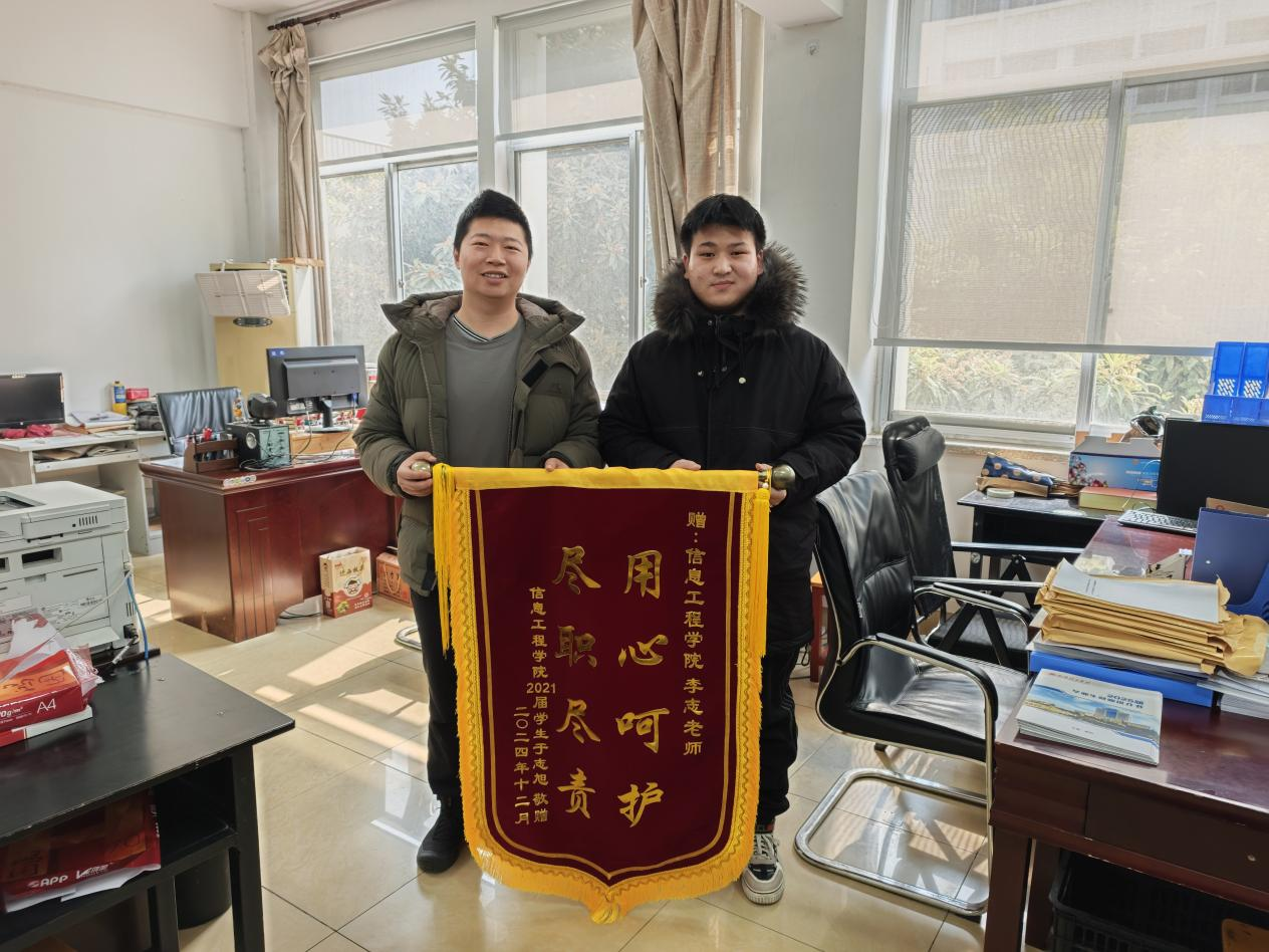 于志旭住院治疗期间,李志老师始终牵挂着他的情况,多次前往医院探望,鼓励他积极配合治疗,并帮助他解决学习和生活上的困难。出院后,李志老师亲自为于志旭办理了校外住宿的手续,期间经常线上线下关注学生恢复情况,叮嘱他时刻注意自身身体状态变化。如今,于志旭已经完全康复,重新回到了校园。为了表达对李志老师的感激之情,他特意送上了带有“用心呵护 尽职尽责”的锦旗。于志旭说:“这面锦旗不仅代表着我的谢意,更代表着我对李志老师的敬意,他用实际行动诠释了什么是“用爱守护,用心育人”。