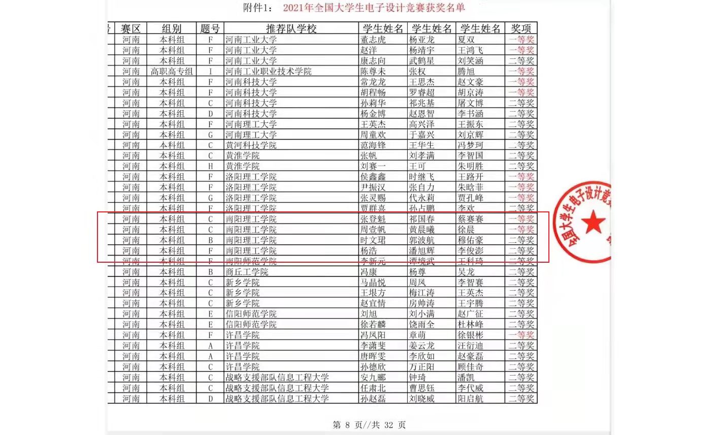 本网讯(特约记者/韩璞)近期,2021年全国大学生电子设计竞赛决赛和河南省赛区成绩公布,我校代表队获得全国一等奖2项,全国二等奖2项,河南省一等奖6项,河南省二等奖11项,河南省三等奖5项的优异成绩,为学校争得宝贵荣誉。