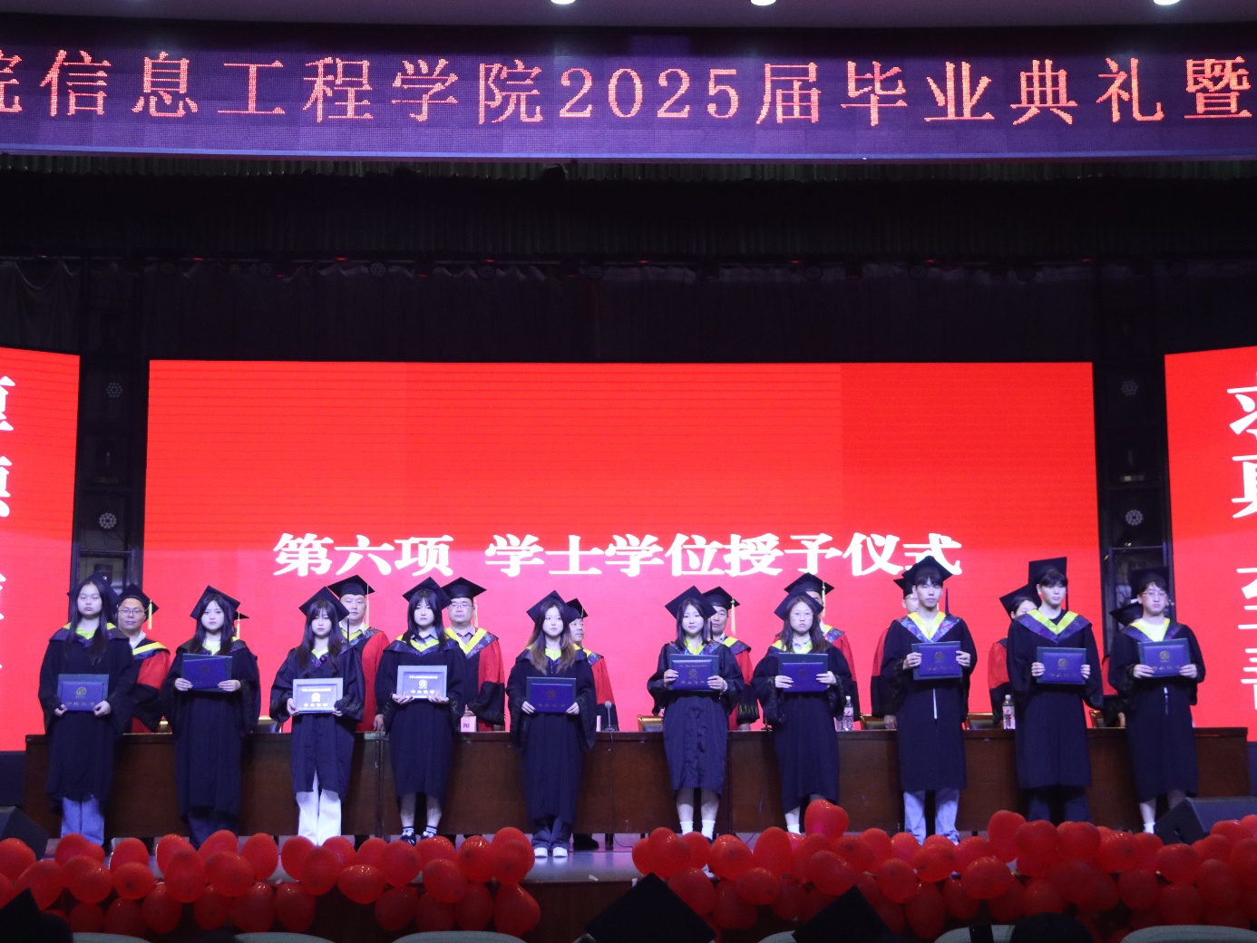 仪式上,学院副院长黄大勇宣读“信息工程学院获得2025年校级优秀应届毕业生、河南省优秀应届毕业生名单”,副院长王运锋宣读了“信息工程学院2025年优秀毕业论文、优秀毕业设计作品获奖名单”。现场掌声雷动,师生共同为获奖者的努力与成就喝彩。