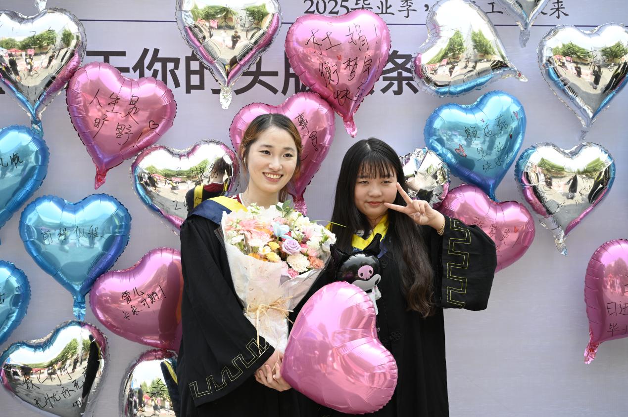 活动现场,学院为毕业生精心准备了数百只彩色心形气球和定制贴纸。同学们在气球上写下对母校的感谢、对师友的不舍以及对未来的期许。例如,有的毕业生以校园地标为灵感创作:图书馆、实验楼、食堂的卡通形象跃然气球上。随后他们将气球粘贴至高达5米的巨型留言墙上。随着一个个承载着深情的气球被固定在留言墙上,一面充满温情的“告白墙”逐渐成型,每一笔字迹都流淌着毕业生与母校的深厚情谊。一笔一划间,是对母校的眷恋,更是对未来的期许。