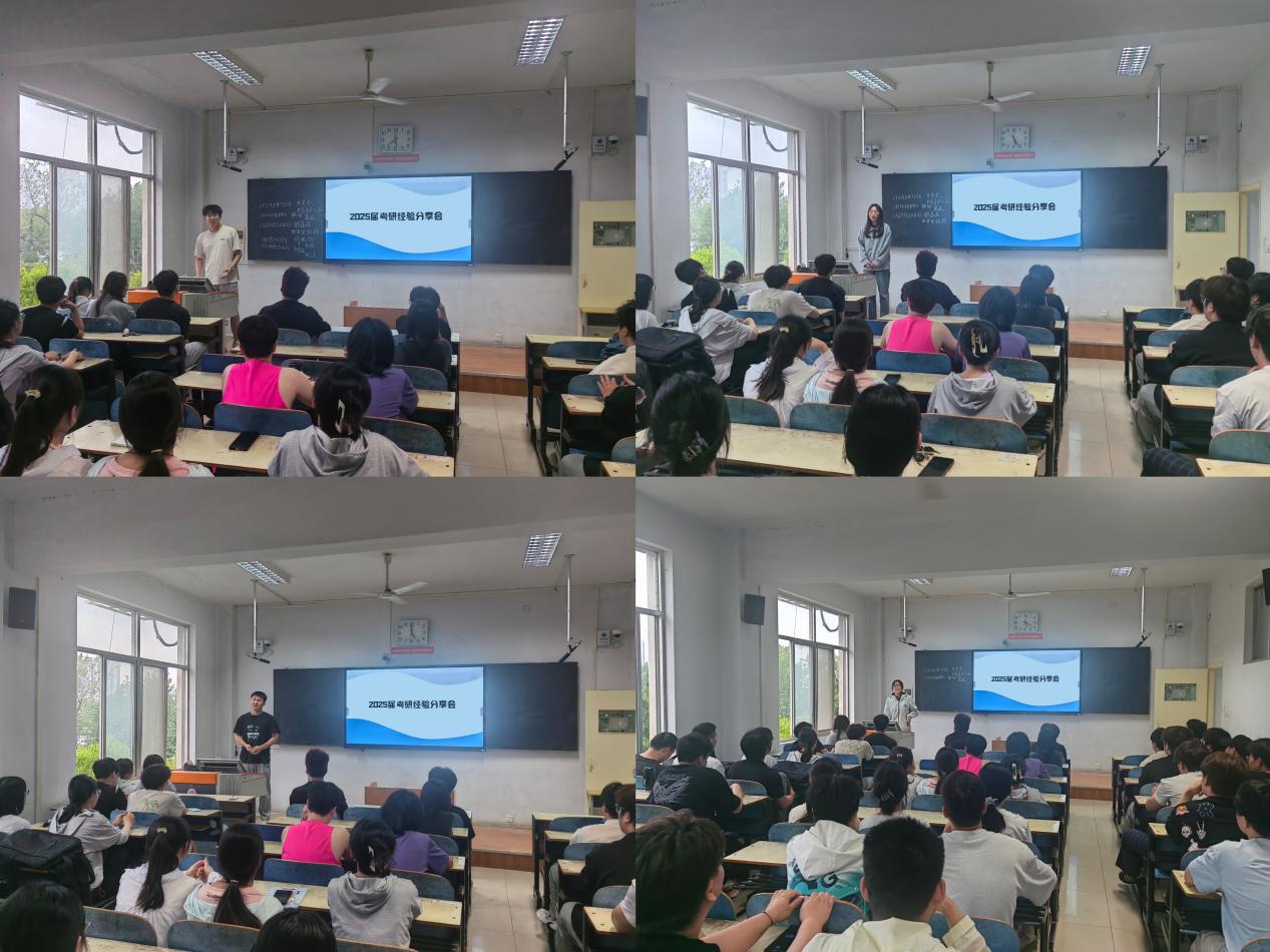 本网讯(学生记者/王蓝平)5月22日,为帮助低年级学生明晰考研方向、掌握科学备考方法,激励他们对于考研的信心和斗志,信息工程学院于14教开展了2025届毕业生考研分享会。本次活动邀请2025届考研成功上岸中国海洋大学、西北工业大学(西工大)、中国科学院西安光学精密机械研究所(西安光机所)等高校的学生担任主讲,学院部分低年级学生参与此次活动。