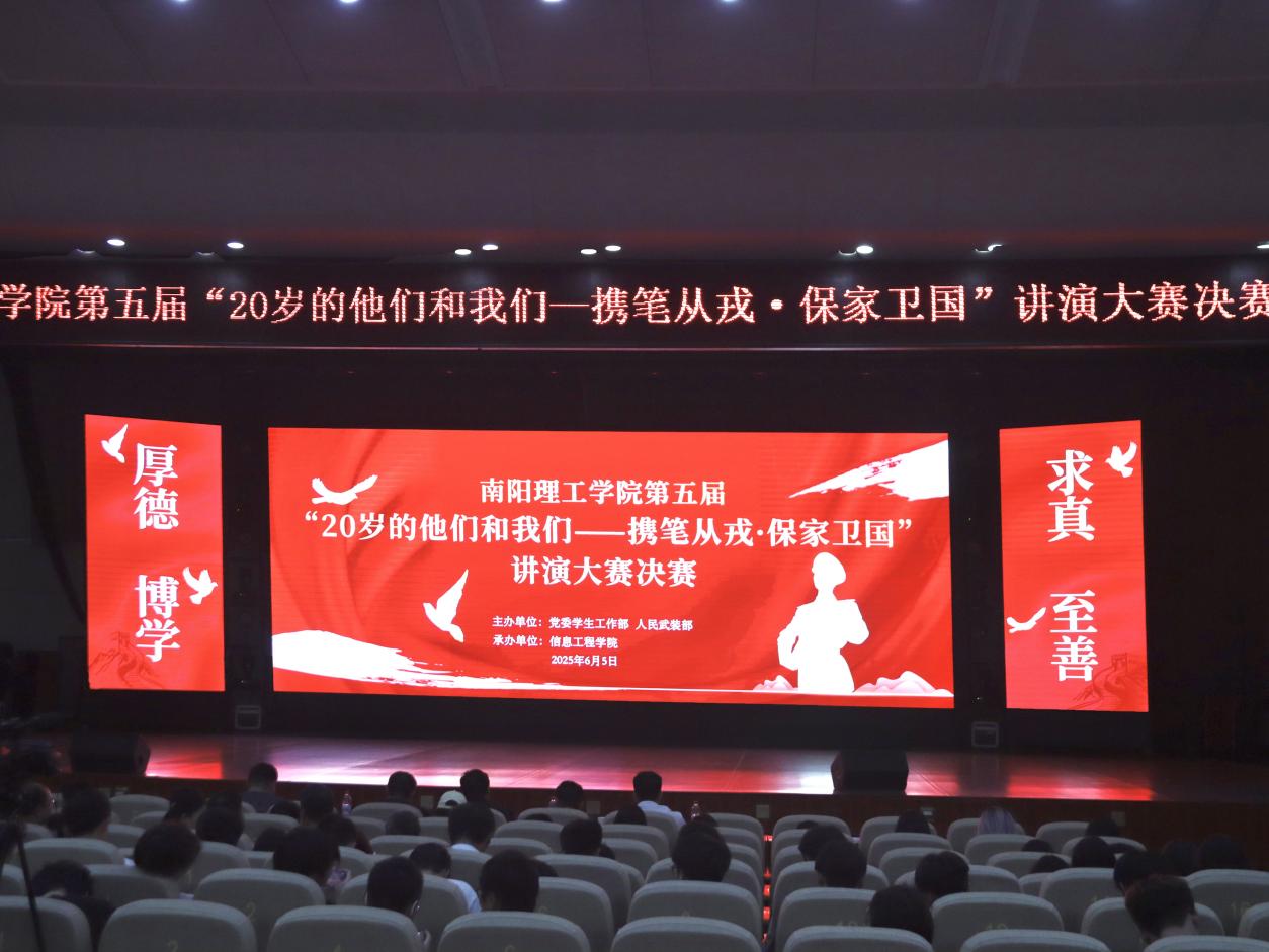 本网讯(特约记者/刘鑫宇 学生记者/陈琮太)6月5日晚,南阳理工学院第五届“20岁的他们和我们—携笔从戎·保家卫国”讲演大赛决赛在毕业大厅隆重举行。校党委副书记、工会主席董豪出席活动,党委统战部、党委学生工作部、人民武装部、部分教学院主要负责同志及近600名师生观看比赛。