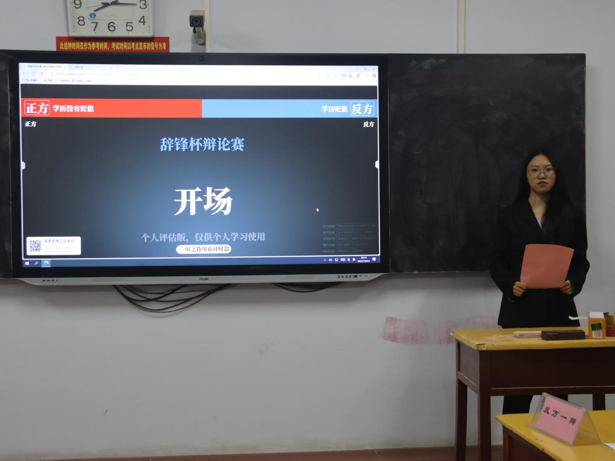 晚上七点,辩论赛准时拉开帷幕。主持人首先向在场师生介绍了比赛规则与辩题背景,随后,正反双方围绕 “学历是否贬值”这一核心议题展开了激烈交锋。正方以学历作为人才基础筛选标准的不可替代性为核心,结合就业市场实际需求,系统阐述了学历在职业发展中的底层价值。反方则聚焦“学历泡沫”“技能与学历脱节”等社会现象,通过实例论证能力导向在人才评价体系中的关键作用。