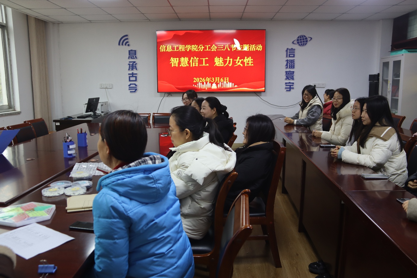 本网讯(学生记者/苏婧媛)为庆祝“三八”国际劳动妇女节,丰富女教工的业余文化生活,3月6日,信息工程学院于216会议室开展了以“智慧信工 魅力女性” 为主题的三八节趣味活动,学院全体女教师共同参与。
