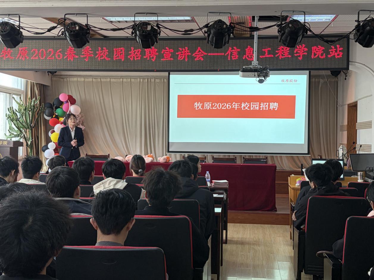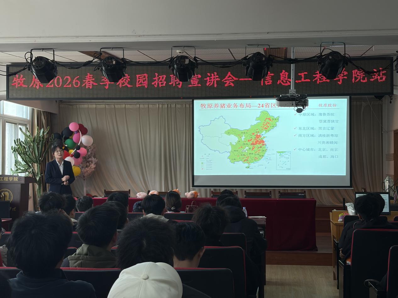 宣讲会上,牧原的校招负责人详细介绍了牧原食品股份有限公司的发展概况,包括企业的发展历程、产业链布局、人才培养体系及薪酬福利保障等。随后,他重点讲解了2026春季招聘的核心岗位,尤其是与我院专业高度匹配的技术类岗位,详细解读了各岗位的任职要求、工作内容、职业发展通道及晋升机制,让同学们清晰把握求职方向。
