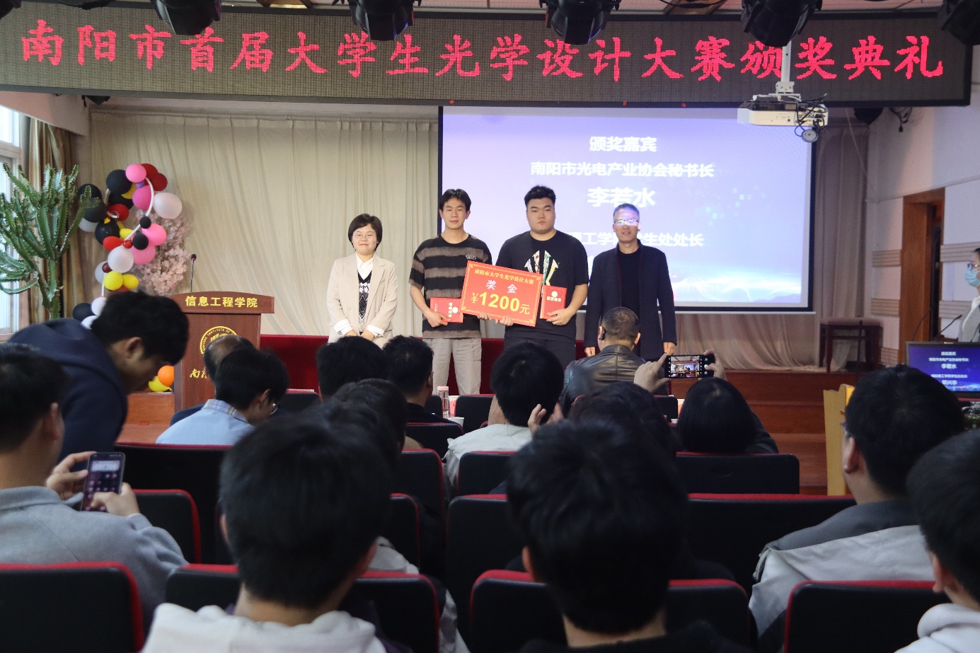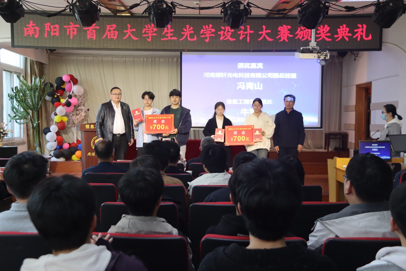 南阳市光电产业协会秘书长李若水、河南翊轩光电科技有限公司副总经理冯青山、南阳示佳光电有限公司镜头事业部总监郭富、学校学生处领导以及学院相关领导、教师代表、获奖学生共同参加。
