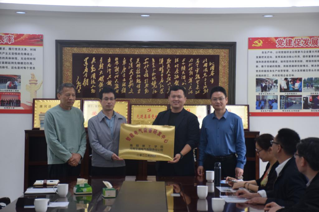 郝好山与河南亚圣电气有限公司、唐河耀皓电子有限公司、南阳格瑞光电科技股份有限公司负责人共同为校企合作研发中心举行揭牌仪式。