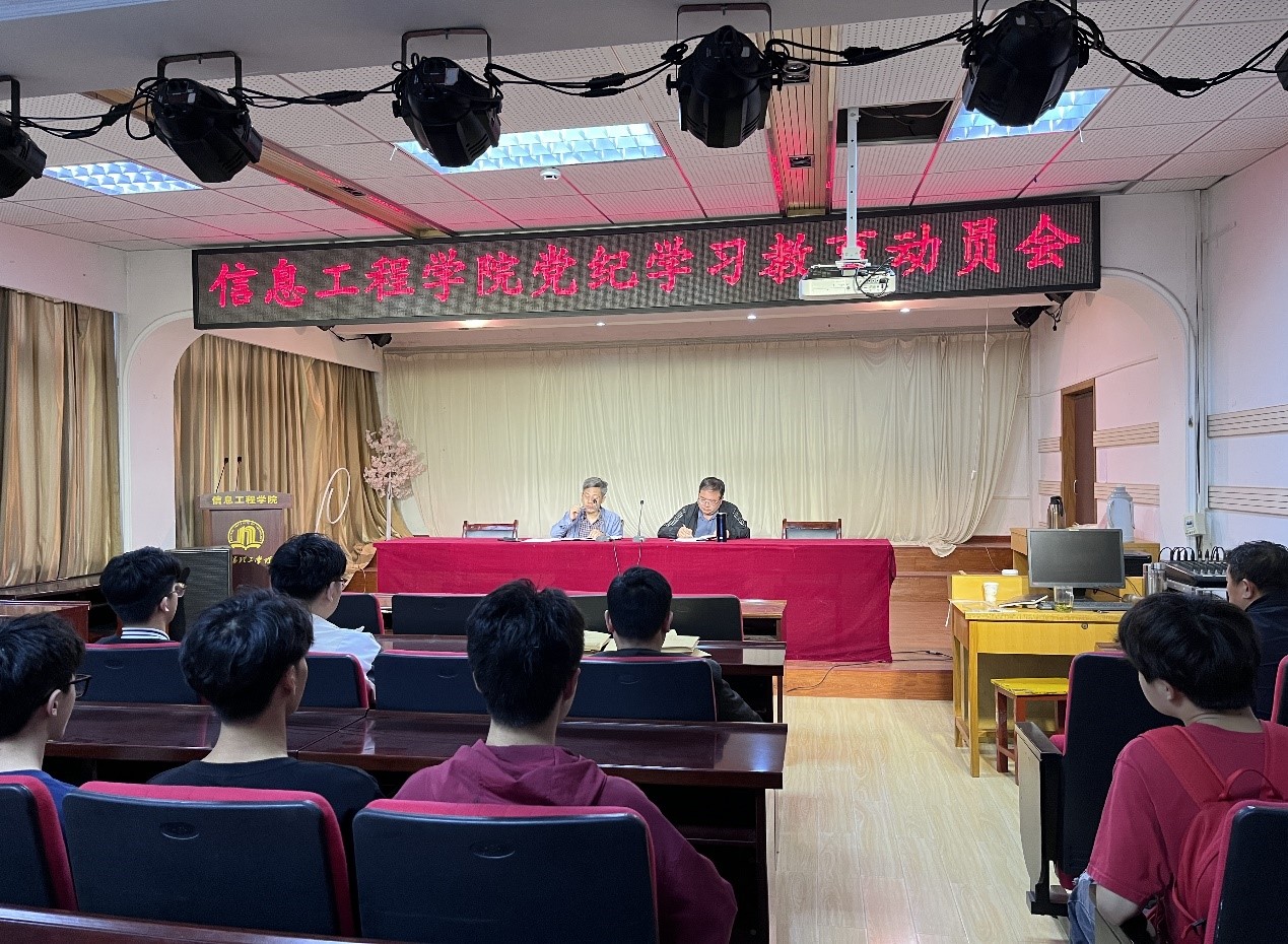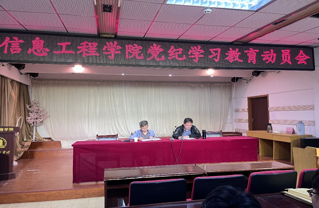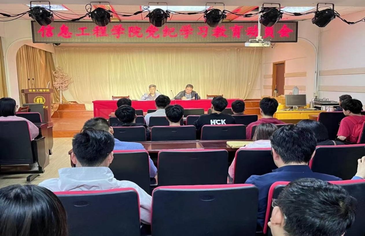 本网讯(学生记者/邵昱昊)为落实上级会议精神,筑牢全院党员的纪律规矩意识,4月19日,信息工程学院党委于12教209召开党纪学习教育动员会,会议就学院党纪学习教育工作进行了全面安排部署,并对党规党纪进行集中组织学习。学院领导班子成员、党支部书记和师生党员代表出席会议。