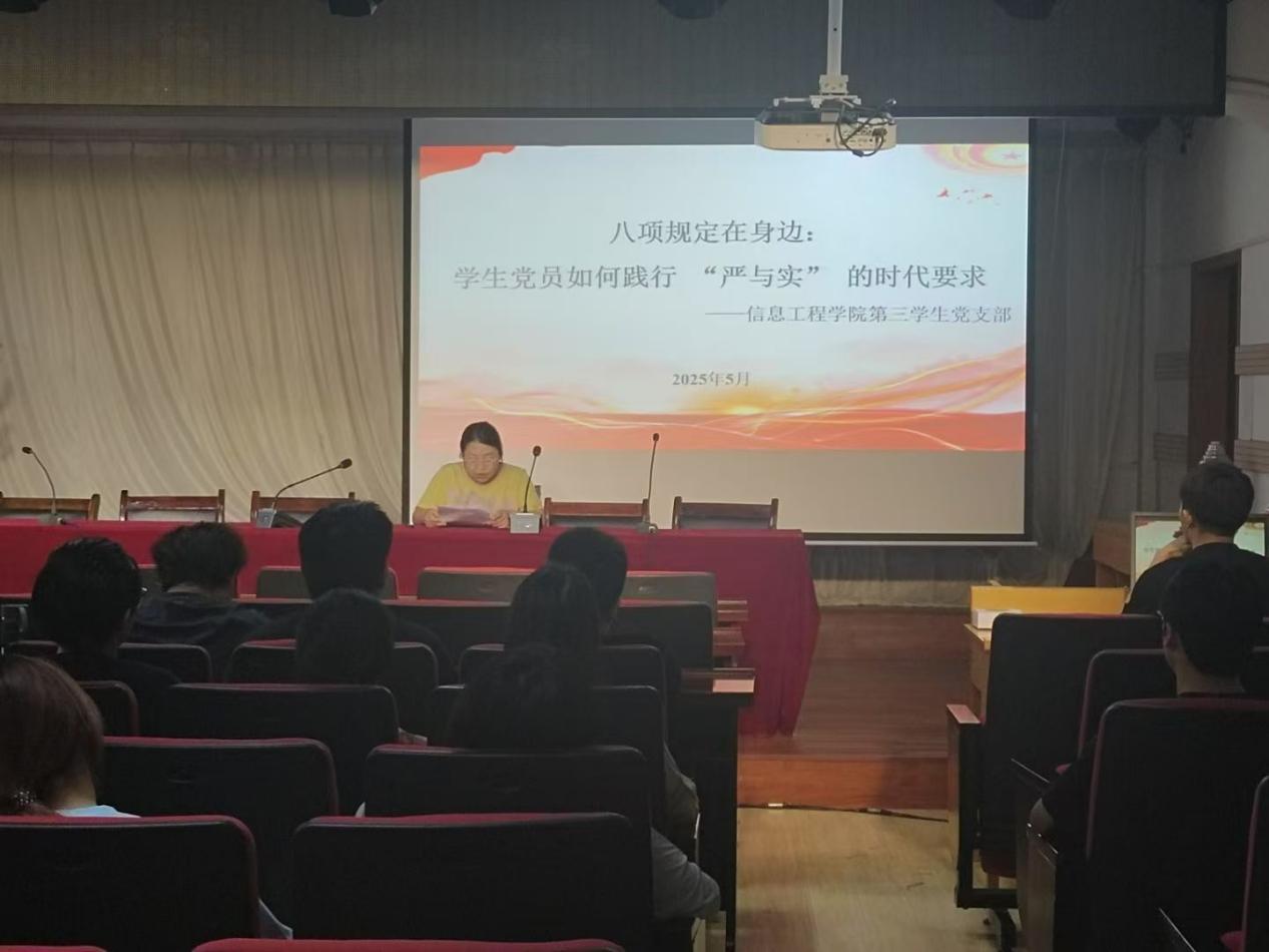 本网讯(学生记者/王广阔)为强化学生党员纪律意识,引导其践行新时代使命担当,6月17日,信息工程学院第三学生党支部在12教209组织开展“中央八项规定在身边:学生党员如何践行‘严与实’的时代要求”专题党课。第三学生党支部书记刘鑫宇、支部成员共同参与。