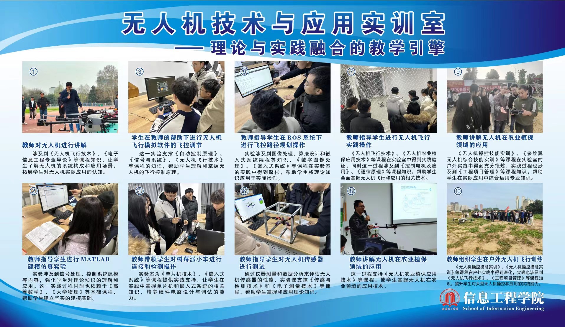 无人机技术及应用实验室的建立,旨在为电子信息工程、光电信息科学与工程、物联网工程、通信工程等信息工程学院的主要专业提供一个集理论学习、实验操作与技术创新为一体的高水平实践平台。实验室秉承“理论与实践相结合”的教学理念,通过实践操作加深学生对无人机技术及其应用的理解,培养学生的创新能力和解决实际问题的能力。
