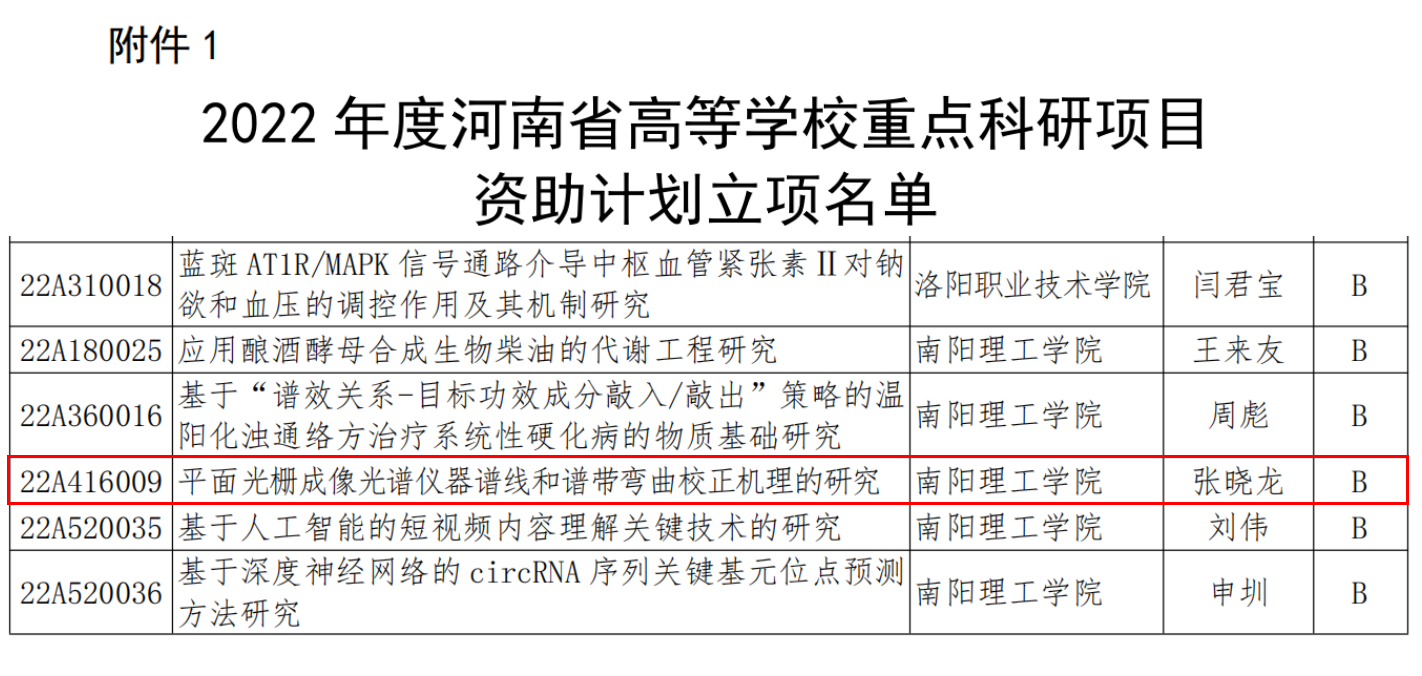 本网讯(特约记者/曹原)近日,河南省教育厅发布了“关于2022年度河南省高等学校重点科研项目计划立项的通知”,我院张晓龙博士申请的“平面光栅成像光谱仪器谱线和谱带弯曲校正机理的研究”项目顺利通过评审,并获得经费支持。