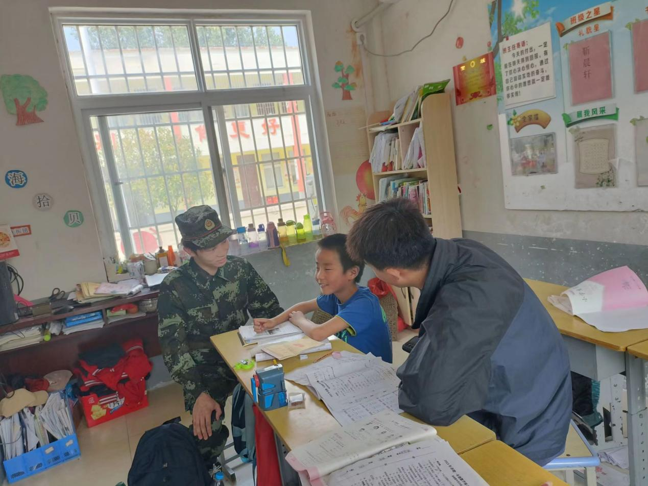 集体宣讲结束后,团队指导老师关阳和学生秦天琦与一位有参军入伍梦想的一年级小学生进行交流。在谈话过程中,了解到小朋友的哥哥就是一名军人,他长大了也想像哥哥一样,看到小朋友那诚挚的眼神,关阳和秦天琦鼓励他先从学习国家领土和主权安全相关知识做起,先具备基本的理论素养,再逐渐培养爱党爱军爱国的情感。