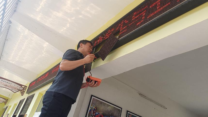 抵达镇平县黑虎庙小学之后,服务队成员拿起维修工具,在负责人的带领下仔细排查安全隐患,依次查看墙壁LED屏、食堂大蒸笼用具、教室里的办公电脑等常用电器设备。经过指导老师和队员们的耐心修理,损坏的电器得以重新运作。工作之余,服务队还向学校的师生宣传安全用电注意事项、用电事故预防处理等相关知识,得到了学校老师们的一致好评。