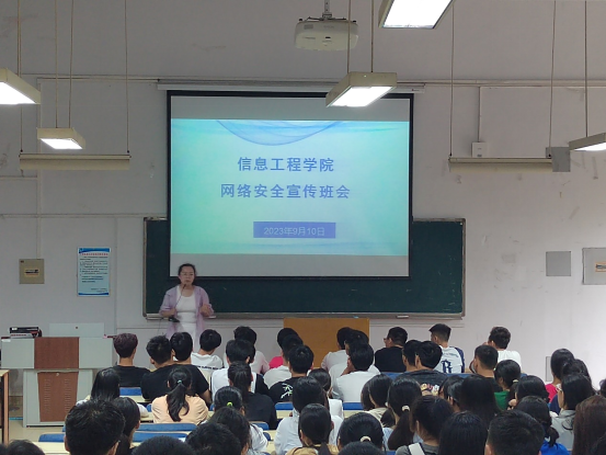本网讯(学生记者/张以山)9月10日,为提高同学们的网络安全意识,加强同学们对网络应用的意识防范。信息工程学院在14教102室、106室开展网络安全主题班会,本次班会由23级辅导员刘宇鑫、徐梦霖主持,23级新生参加。