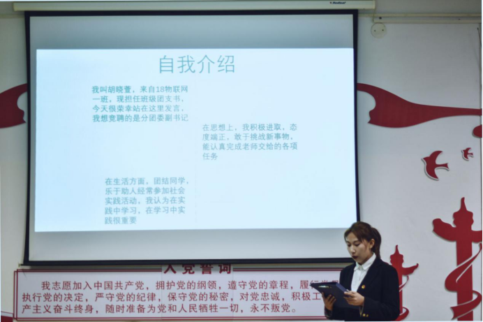 本网讯(学生记者/王雪儿、姚先玲、丁奇帅)10月23日,共青团信息工程学院委员会在12号教学楼116会议室举行第一届学生干部竞聘选举大会。学生工作办公室主任赵杰出席并主持会议,学生辅导员张露老师、邹军燕老师、徐扬老师、徐英昭老师出席并担任评委,20级班级导师助理观看此次大会。