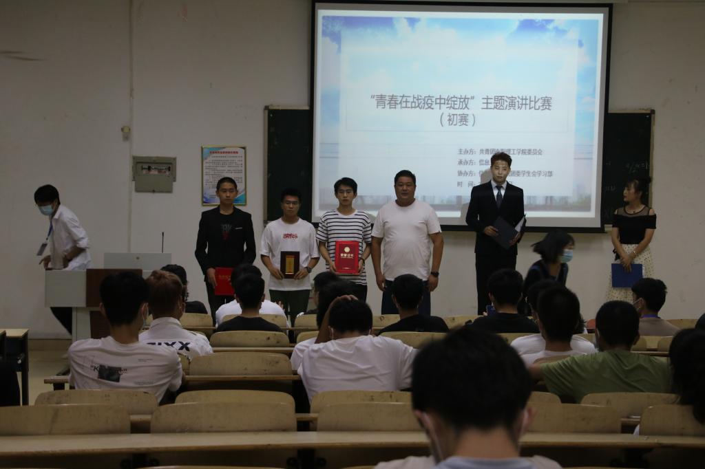 本网讯(学生记者/丁奇帅)9月14日,信学生记者息工程学院在7阶101教室举办“青春在战疫中绽放”主题演讲比赛初赛,团学办主任赵杰出席并担任评委。