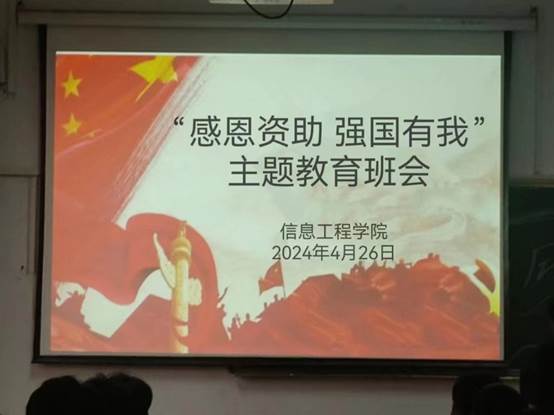 本网讯(特约记者/关阳、学生记者/殷志宏、王越)4月26日晚,为加强资助宣传教育,弘扬励志精神,培育感恩意识,提升“资助育人”实效,树立正确的价值观,传播正能量。信息工程学院于10号教学楼412室开展“感恩资助,强国有我”主题教育班会,全体23级学生参加。