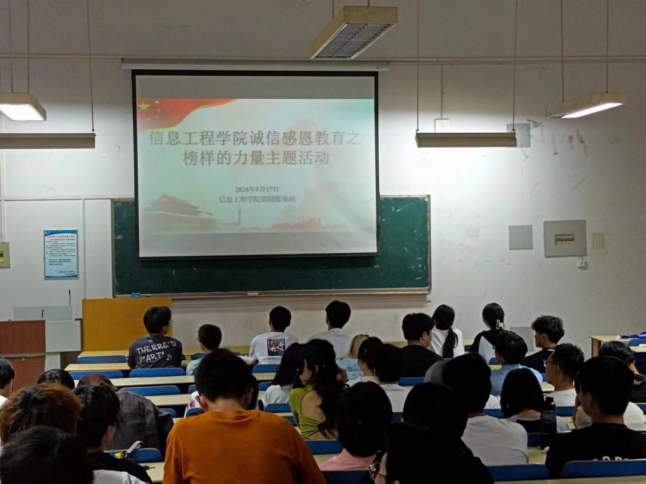 本网讯(学生记者/赵晨凯)为了充分发挥榜样的示范引领作用,进一步弘扬诚信、感恩的价值观念,增强资助育人成效。5月17日,信息工程学院于14号教学楼102室举办“诚信感恩教育之榜样的力量”主题活动。信息工程学院优秀毕业生代表蒿梓烨等三位同学参与宣讲,及2022级全体学生参加活动。