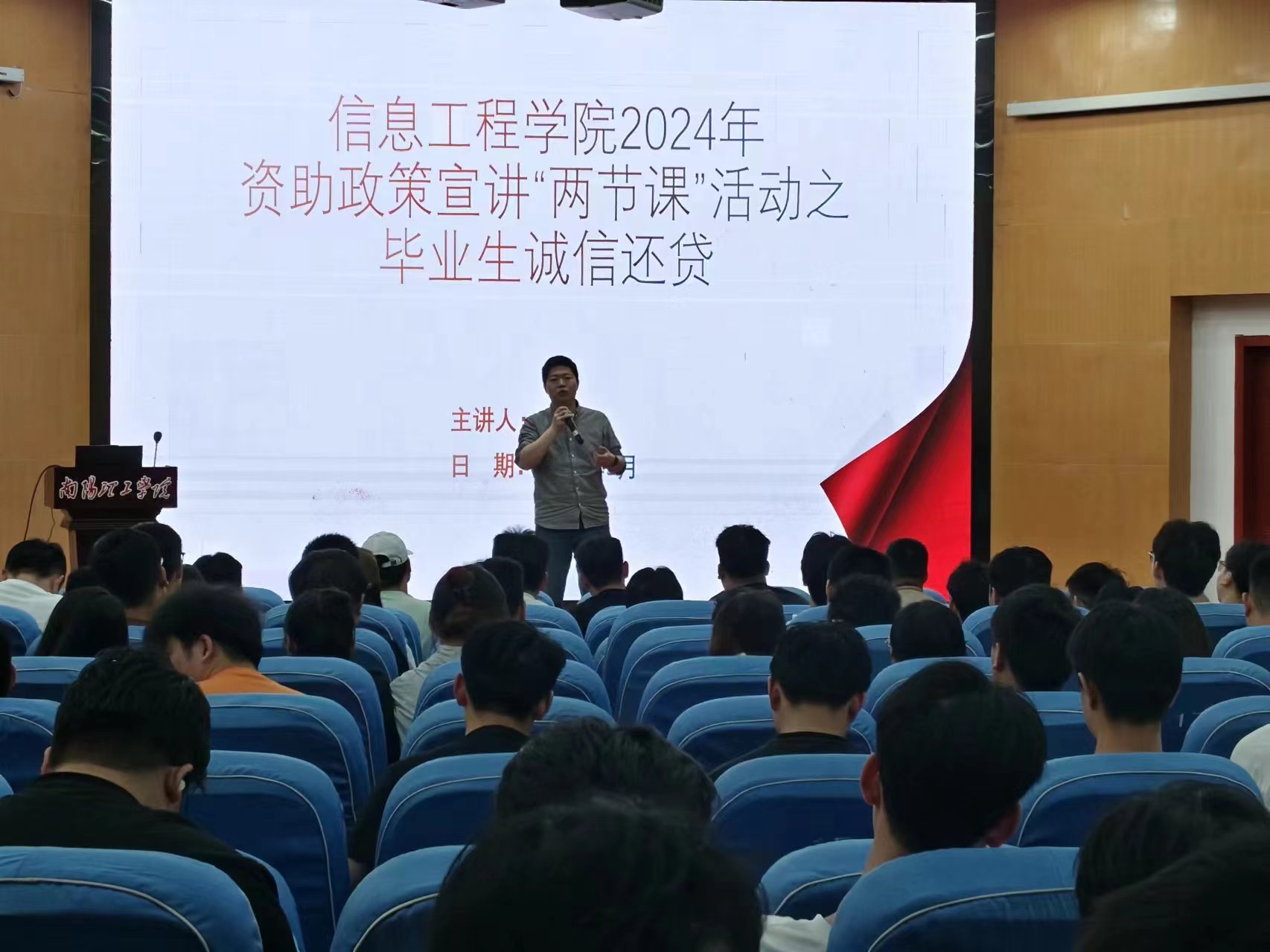 本网讯(学生记者/郭雨涵)为了加强学生的诚信教育和责任感教育,提高学生的征信意识、法律意识,促进学生的全面发展。5月17日,信息工程学院于第二报告厅开展2024年资助政策宣讲“两节课”活动之毕业生诚信教育,参与此次活动的有信息工程学院李志老师和全体24届毕业生。