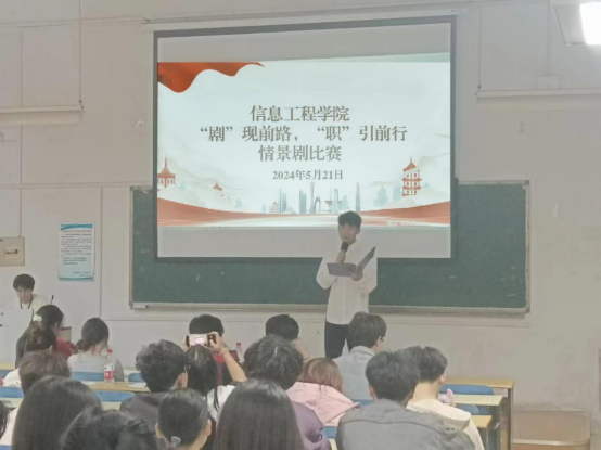 本网讯(学生记者/贾思彤)5月21日,为引导我院学生树立正确的就业观念,明确奋斗方向。同时,提高大家对安全就业的重视程度,增强求职风险防范意识,促进学院就业工作高质量发展。信息工程学院于14号教学楼102教室举办了“‘剧’现前路,‘职’引前行”情景剧比赛。22级、23级部分学生参加。