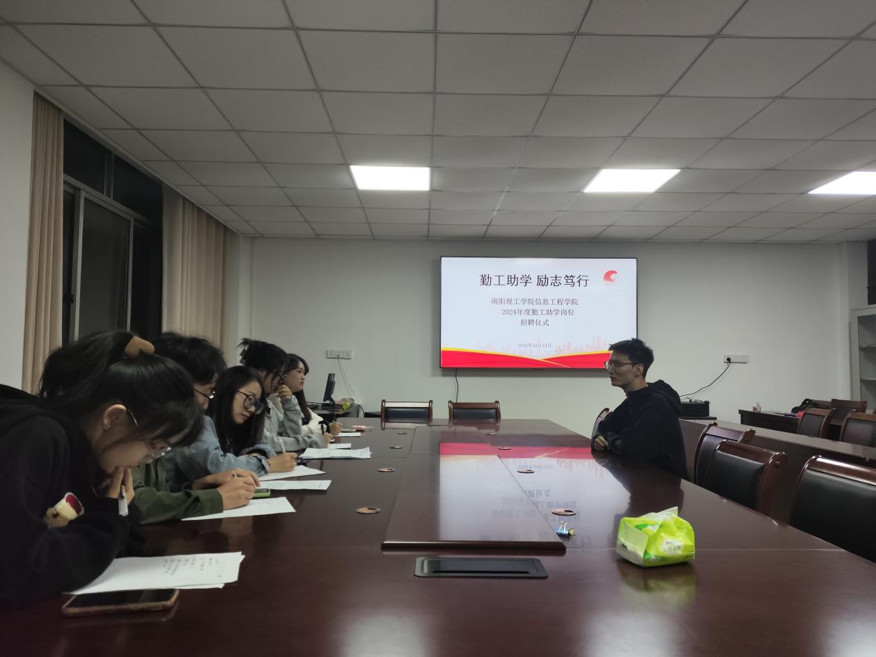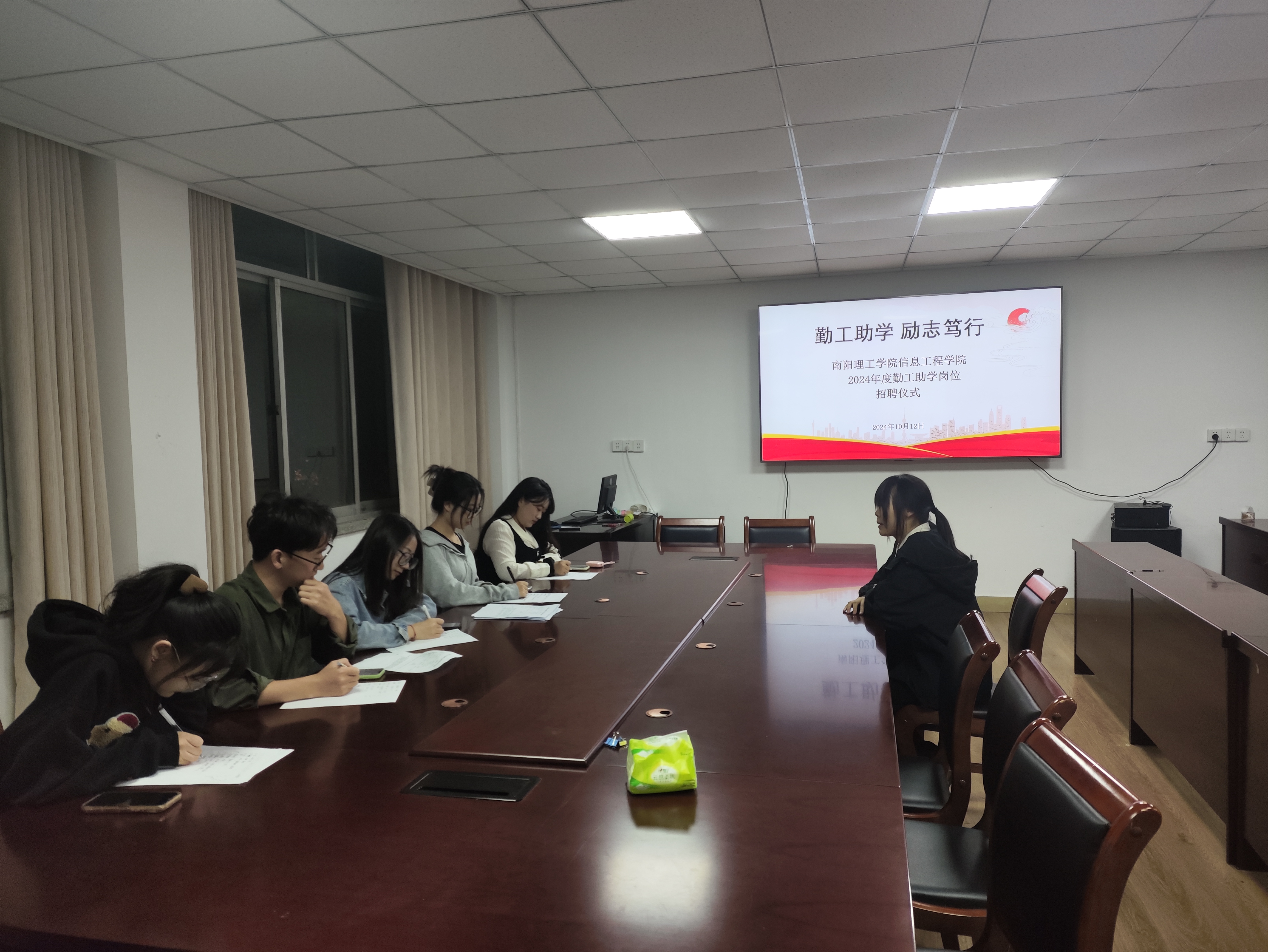 本网讯(特约记者/关阳 学生记者/郭雨涵)为了帮助经济困难学生顺利完成学业,给学生提供实践锻炼的机会,助力学院优化勤工助学资源配置,增进师生交流,10月13日,信息工程学院于12号教学楼216会议室开展2024年度“勤工助学,励志笃行”勤工助学岗位招聘会。信息工程学院资助服务站勤工助学部同学负责面试工作。