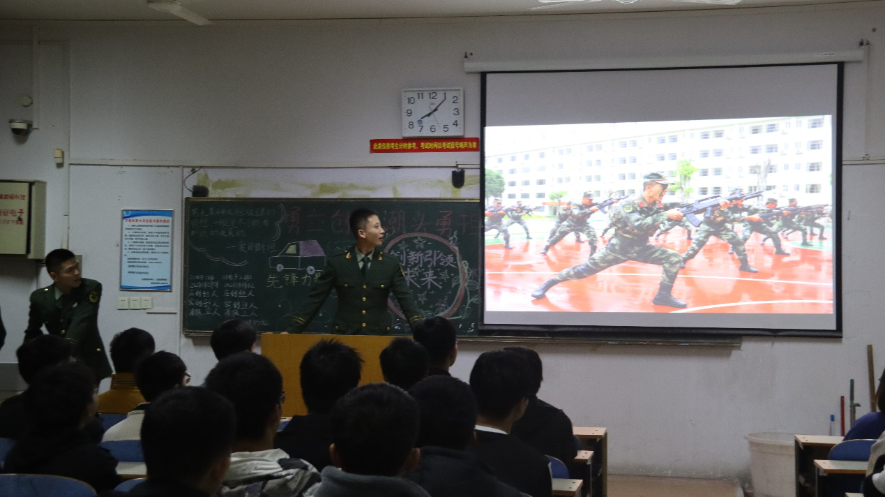 三名退伍大学生穿着整洁的军装、踏着整齐划一的步伐依次进入班级,随后他们便开始与同学们进行交流分享,一字一句间,尽显军人本色。三名退伍大学生以PPT、视频、图片的形式分享了自己在军旅生涯中的所见所闻,投身绿色军营,筑梦无悔青春,他们向大家展现了热血、勇敢、不怕艰苦、英勇奋斗的铁血军人形象,声情并茂地给大家讲解了“携笔从戎,保家卫国”以及国防的意义。并且向大家介绍了大学生参军入伍的一系列政策,在讲解与交流期间,同学们踊跃举手发言,表达了自己对绿色军营的向往和报名参军的意愿。退伍大学生们朴实而饱含力量的讲述,让在场同学敬佩,热烈的掌声经久不息。三位信念坚定、恪尽职守、严谨务实的鲜活榜样人物形象令人动容、催人奋进,充分展现了新时代中国军人践行勇担使命的优秀品质和良好精神风貌。