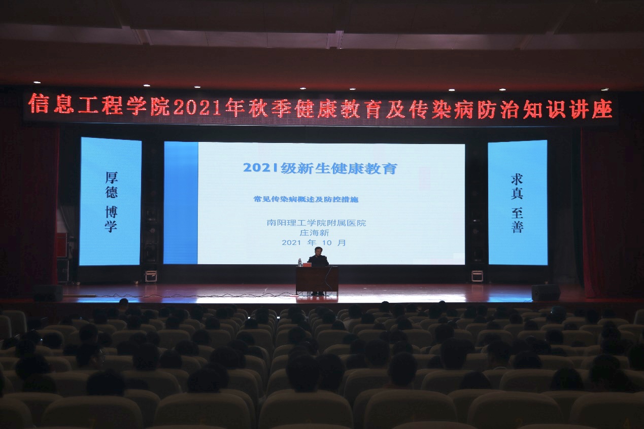 本网讯(学生记者/胡浩洋)10月27日晚,信息工程学院在毕业大厅开展新生传染病防治讲座,南阳理工学院附属医院医生庄海新出席讲座,辅导员李志,21级全体学生参加讲座。