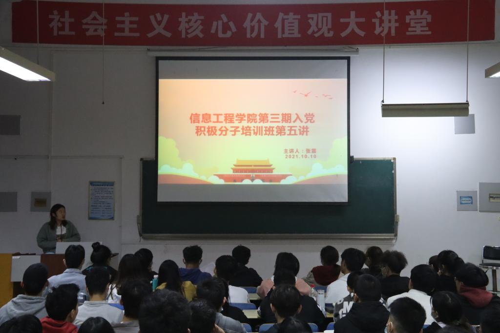 本网讯(学生记者/卢爽)10月10日晚,信息工程学院第三期入党积极分子培训班在14号教学楼202举行,学院第三学生党支部书记张露主讲,第三期入党积极分子参加。