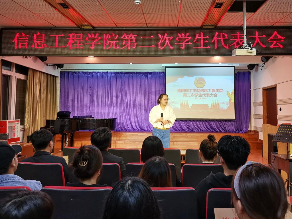 本网讯(学生记者/王海琳)9月28日晚,为了加强信息工程学院学生会力量,保证工作的连续性,发挥我院学生组织的桥梁与纽带作用,充分发挥学生组织服务学校服务同学的主体作用,南阳理工学院信息工程学院第二次学生代表大会在12教207召开。18级辅导员张露,19级辅导员徐梦霖出席此次大会。