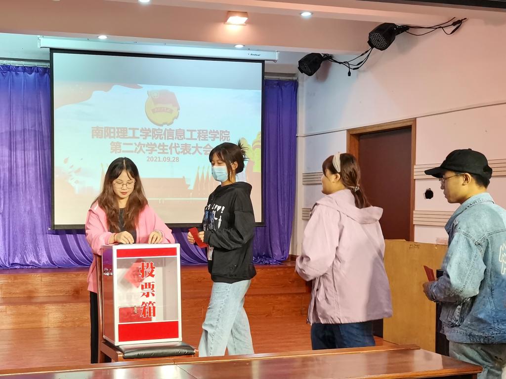 接下来,由各位与会代表通过投票方式选举南阳理工学院信息工程学院第二届学生委员会成员。由我院学生代表李靖妍担任监票人、学生代表王俊涵、李蕊彤担任计票人,监督完成投票并宣布南阳理工学院信息工程学院第二届学生会委员会委员名单。