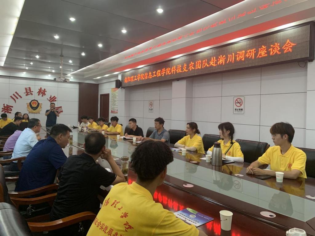 实践服务队于9日下午抵达淅川县林业局参加调研座谈会。林业局机关党委书记周桃龙表示:无人机相关技术的广泛应用为淅川县农林业发展提供了极大便利。防火办负责人陈强向在场师生提出无人机在使用时出现的问题,希望学校能给予一定的技术支撑。双方还就无人机应用中需要优化的地方进行探讨,郭建昌建议将学校专业知识与林业单位的管理相结合,同时提出,双方在科研实践、人才培养上能深入合作。