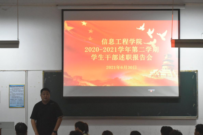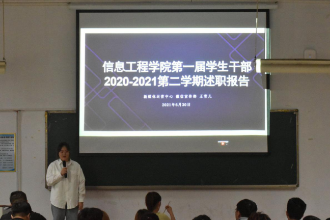 本网讯(学生记者/王海琳)6月30日,信息工程学院召开了学生干部述职报告会。18级辅导员张露、20级辅导员赵杰出席大会,学生会干部及各部门部员参加。
