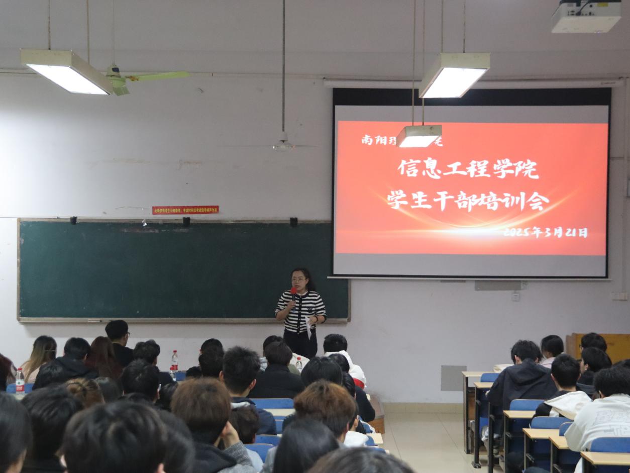 本网讯(学生记者/苏婧媛 黄昊堋)为深化学生会组织改革,提升学生干部履职能力。3月21日,信息工程学院在14教106召开了学生组织述职报告会暨学生干部培训会。辅导员徐梦霖、关阳出席活动,学生会全体成员参加。