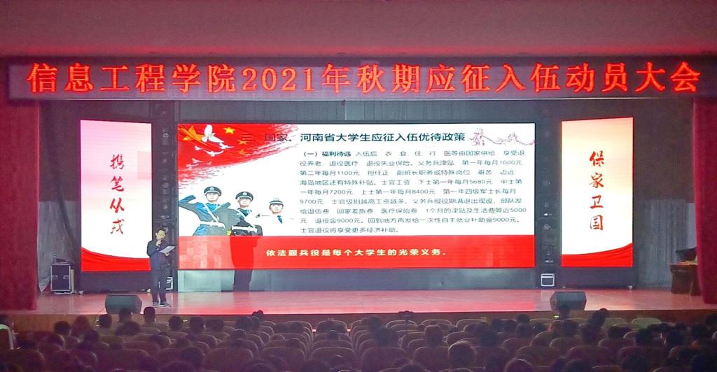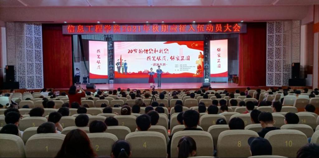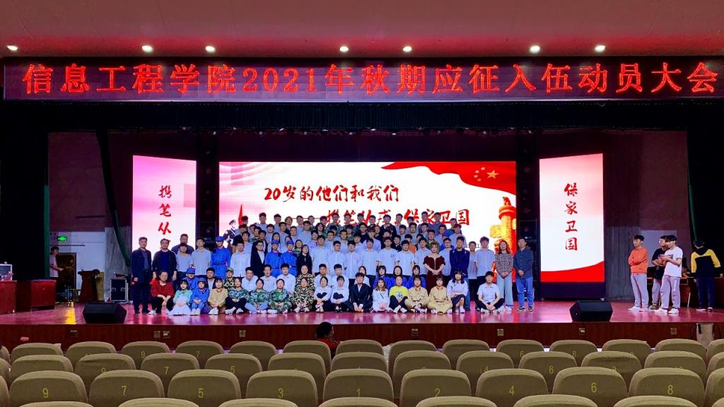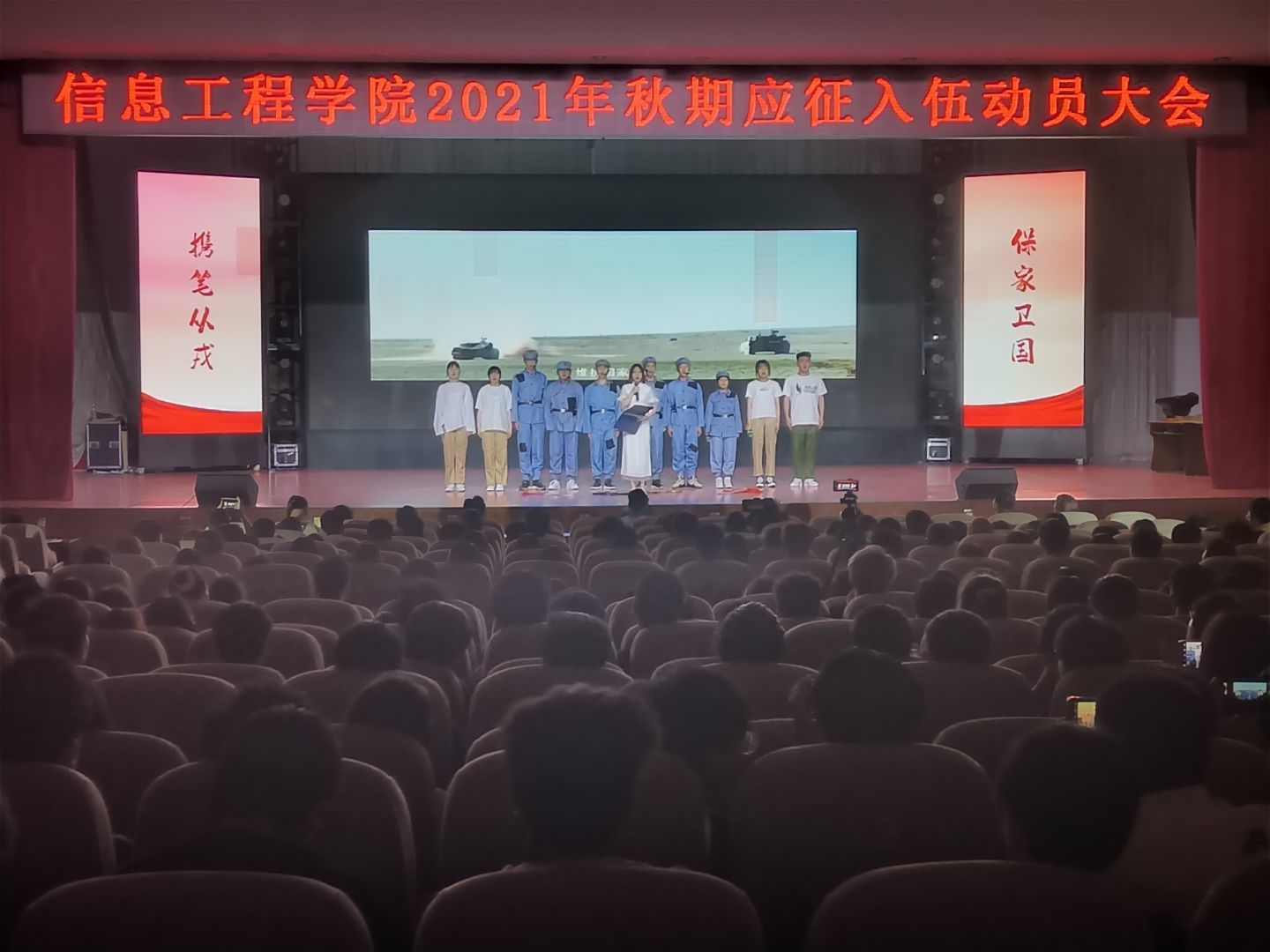 本网讯(特约记者/张露学生记者/丁奇帅、卢爽)4月29日晚,信息工程学院在毕业大厅举办2021年秋期应征入伍动员大会,校党委学生工作部副处长田永磊、校武装部负责老师王吉春、马克思主义学院范洁教授、信息工程学院副院长黄大勇及党委副书记张哲出席大会。