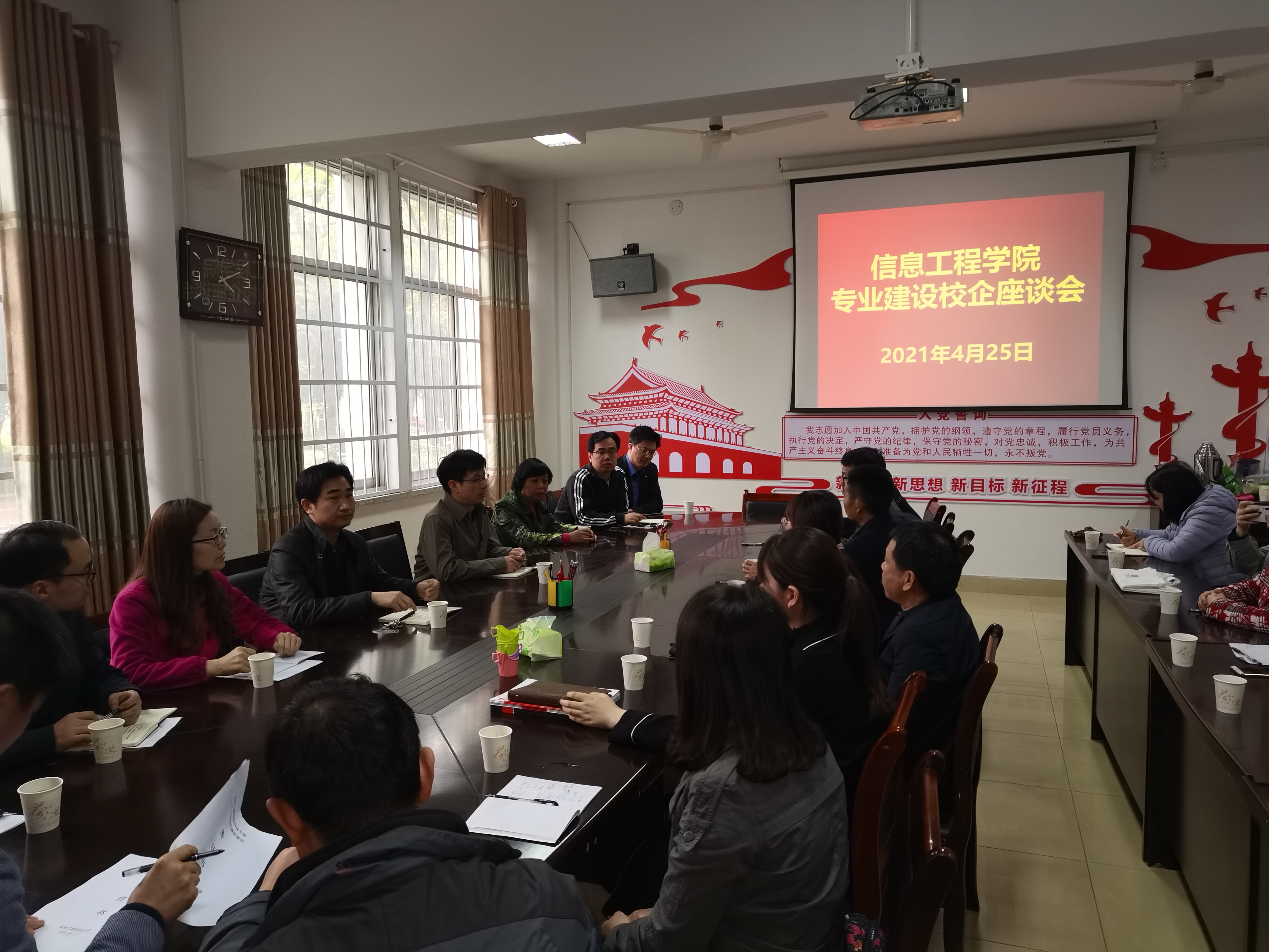 本网讯(特约记者/张哲)为充分了解社会、行业发展需求,加强新工科建设,做好2021版人才培养方案制订工作,4月29日下午,信息工程学院召开专业建设校企座谈会。到会的公司有珠海中京电子电路有限公司、杭州永谐科技有限公司、南阳防爆研究所、启封新源光电科技有限公司等,学院院长乔建良、副院长黄大勇、党委副书记张哲及各教研室部分教师参加会议。