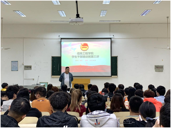 本网讯(学生记者/姚先玲、肖璇)4月26日,信息工程学院在7教201教室举办学生干部培训会第三讲,学生工作办公室主任赵杰主讲,学院全体学生干部参加。