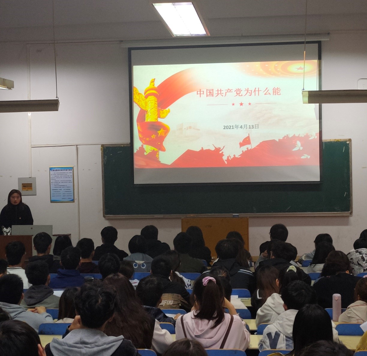 张露从国家实现脱贫攻坚,有效防止新冠疫情等方面引起同学们的思考,表现出中国共产党员的优秀品质,并从有人民至上理念,有科学理论引领,有自我革命精神三方面进行讲述。