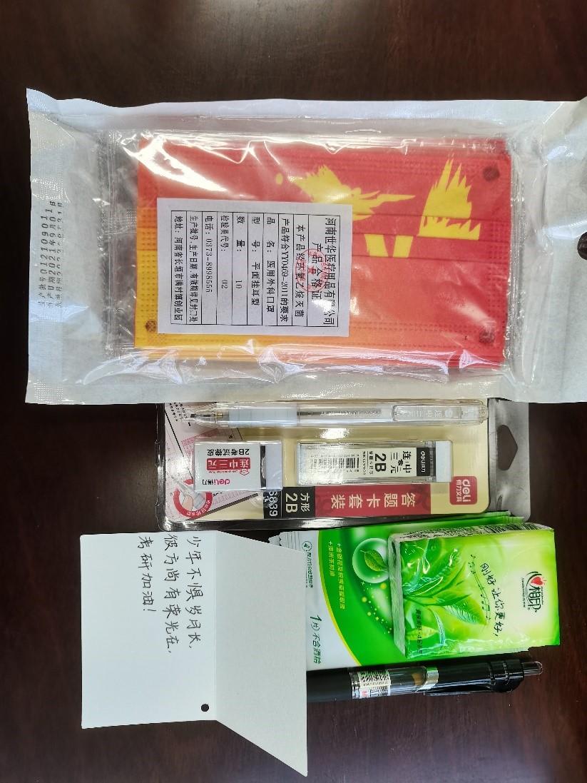 学院教师代表为学生送上了学院准备的考研礼包,礼包中既有答题文具套装、口罩、湿巾、卫生纸等用品,也有老师同学们亲手写下的对考研学子的祝福卡片,一词一句真情流露,温暖的话语激励着考研学子继续前进。