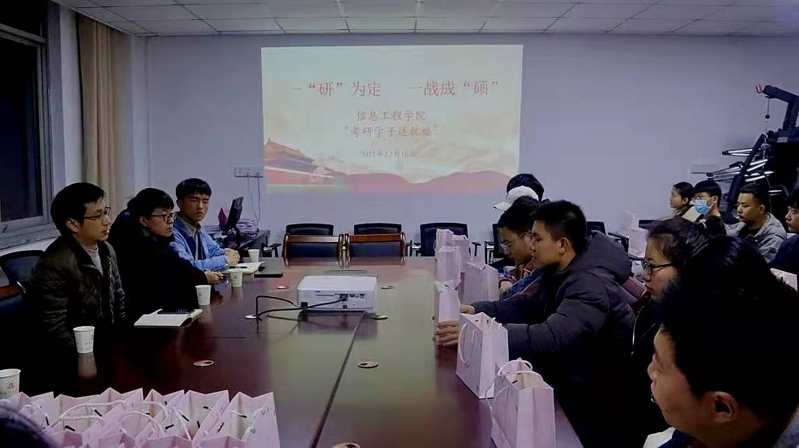 本网讯(学生记者/胡浩洋、闫旭增)临近考研,为缓解考研学子的压力,让他们以更好的状态冲刺考研,12月16日晚上,信息工程学院于12教2楼会议室开展“一‘研’为定、一战成‘硕’”为考研学子送温暖活动,院长乔建良,教师代表郭爽、徐英昭、周荣艳,辅导员张露、李志等到场,为18级考研学子加油助威,送去温暖。
