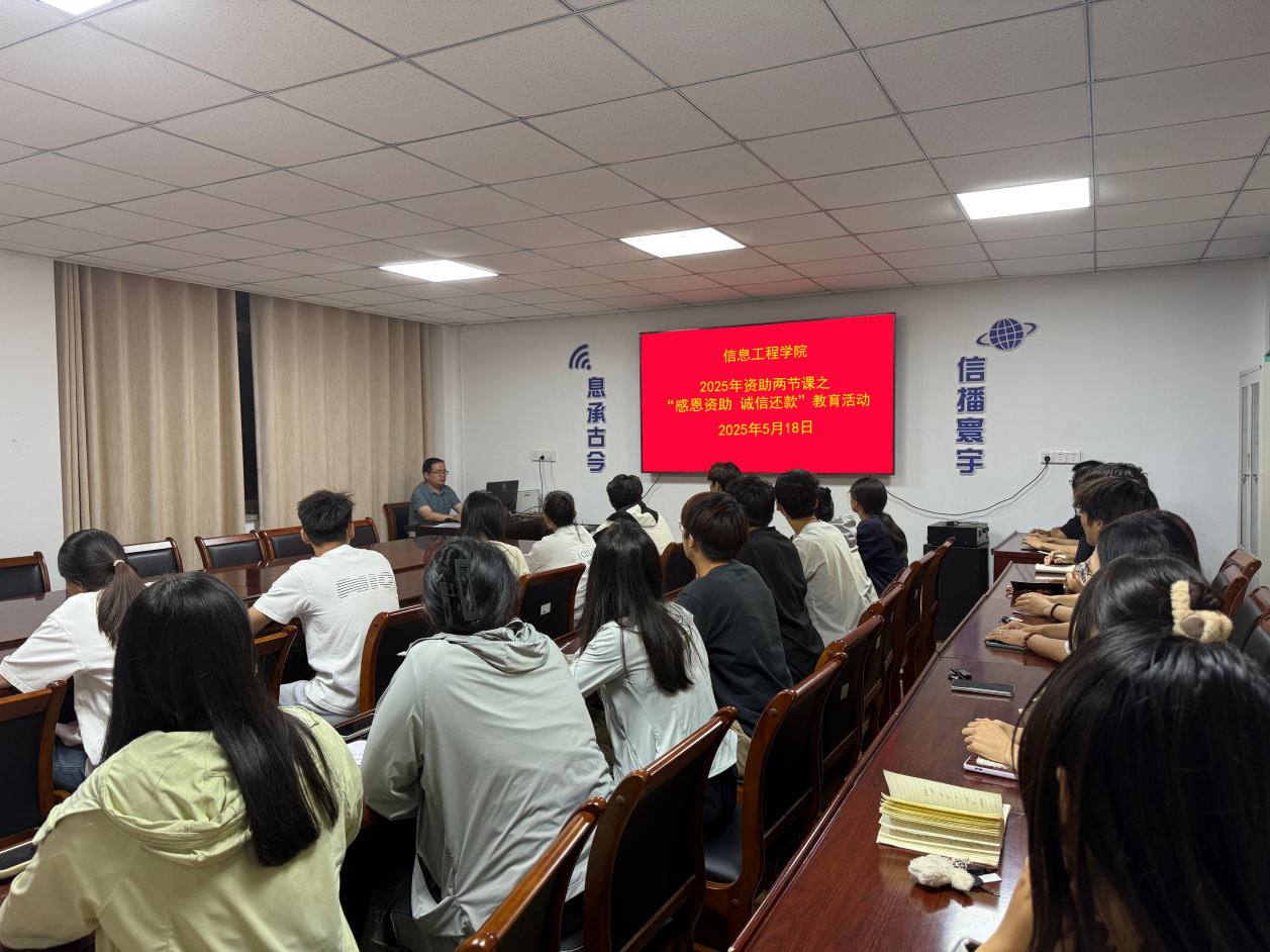 本网讯(特约记者/关阳、学生记者/郭雨涵)5月18日,为深化资助育人成效,强化学生诚信意识与感恩情怀,引导受助学生树立正确的消费观与价值观,规范国家助学贷款还款管理。信息工程学院于12#216举行了2025年资助两节课之“感恩资助 诚信还款”教育活动。学院党委副书记白秋阳出席本次活动,21级受助同学参加。