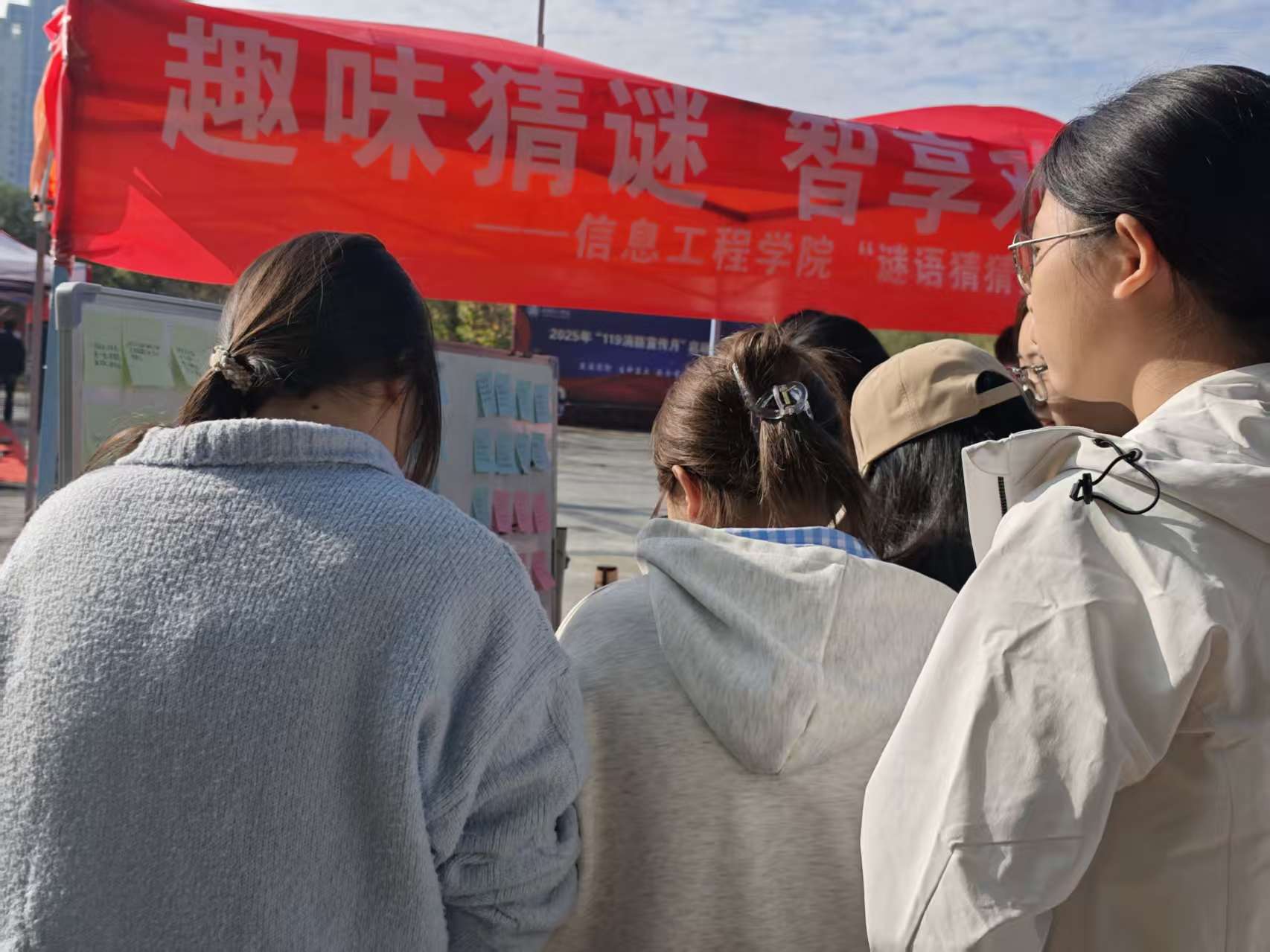 本网讯(学生记者/蒋心睿)11月8日,为锻炼学生逻辑思维、增强人际互动并传播传统文化,信息工程学院于齐贤广场举办“谜语猜猜猜”趣味活动,信息工程学院全体学生参与本次活动。