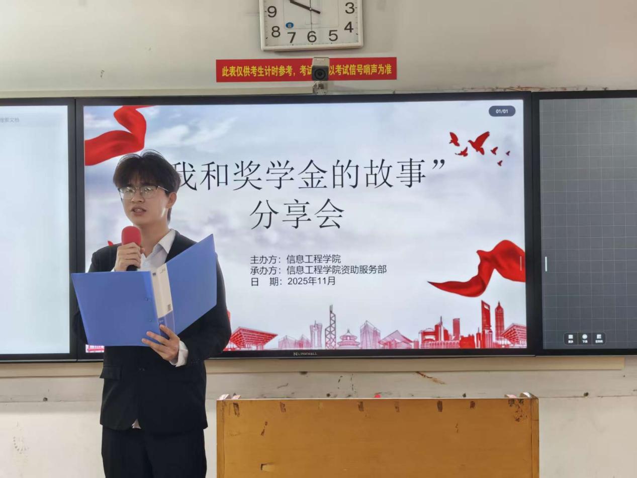 本网讯(学生记者/何希玮)11月23日,为发挥优秀学子榜样作用、助力同学们明确学业方向,信息工程学院于14号教学楼104教室举行“我和奖学金的故事”分享会。资助服务部主席出席本次活动,2023级、2024级国家励志奖学金获得者参与。