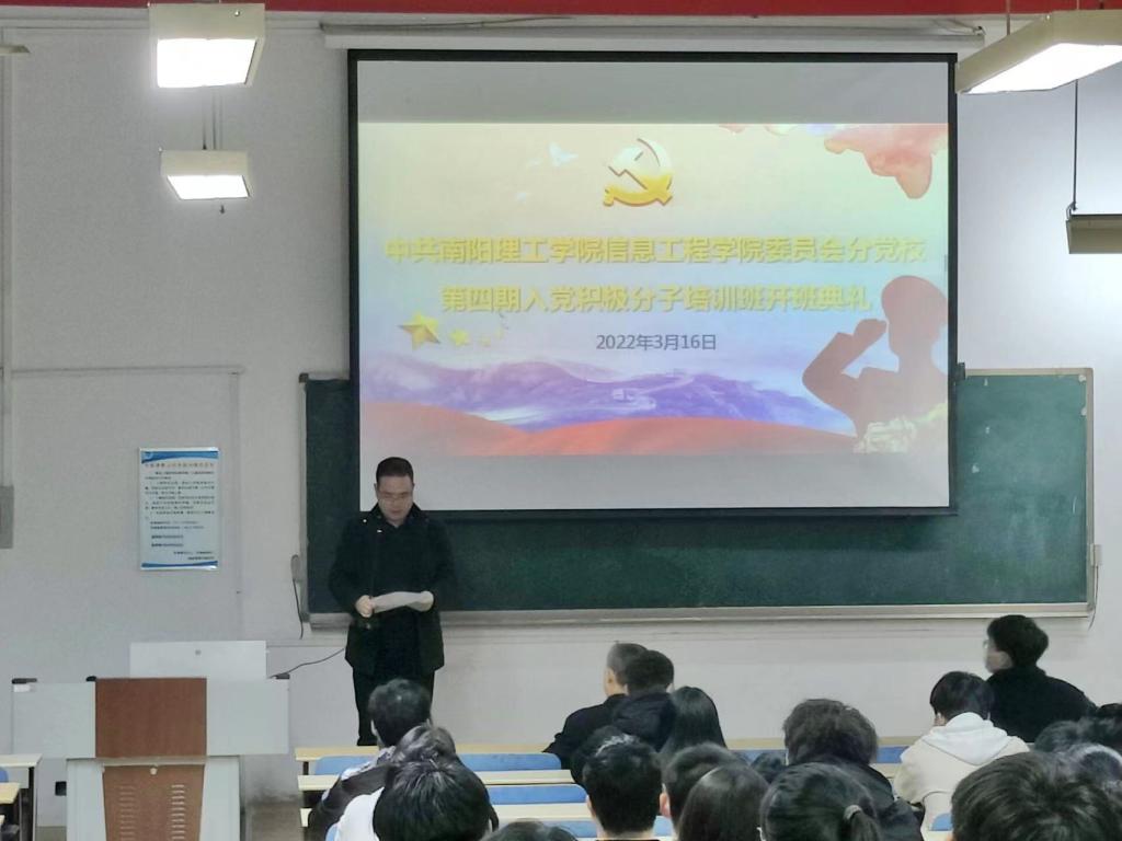本网讯(学生记者/肖淬源)3月16日晚,信息工程学院分党校第四期入党积极分子培训班开班典礼暨专题党课第一讲于14号教学楼202教室举行,学院党委书记常士正主讲,党委副书记白秋阳出席并主持开班典礼,18级辅导员关阳、19级辅导员郭争出席,第四期入党积极分子参加。