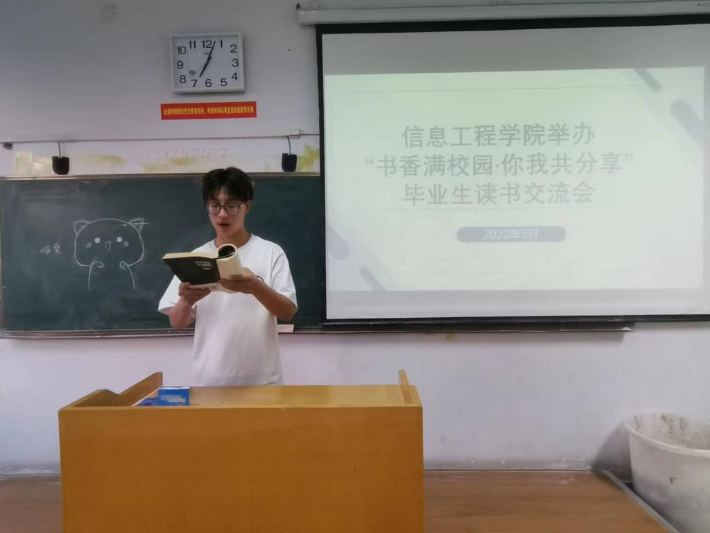 本网讯(特约记者/关阳)5月24日,信息工程学院于12教513教室举办“书香满校园,你我共分享”毕业生读书交流会,毕业生读书爱好者进行分享,21级学生参加。