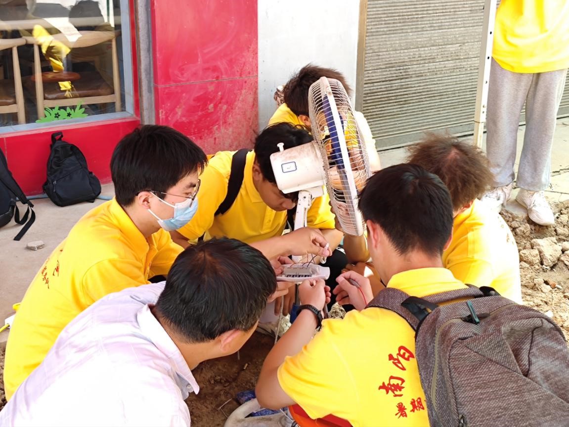抵达镇平县后,服务队分工协作,布置好维修电器的工作棚与维修工具。准备就绪后,周围的居民陆续将损坏的电风扇、收音机、热水壶等家用电器送来维修。在指导老师和队员的精心修理下,一件件家电得以重新运作。工作之余,服务队队员们向周围的群众和行人宣传安全用电、用电事故预防处理等相关知识。一天内共修理充电器、热水壶、电饭煲等小家电十余件,获得了周边群众的肯定和好评。