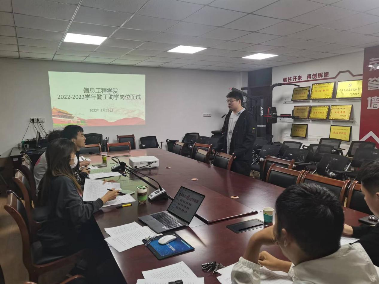 本网讯(特约记者/张露 学生记者/吴梦瑶)9月26日晚,信息工程学院在12教215开展勤工助学岗选拔面试。22级辅导员老师关阳主持,共38名学生参与。