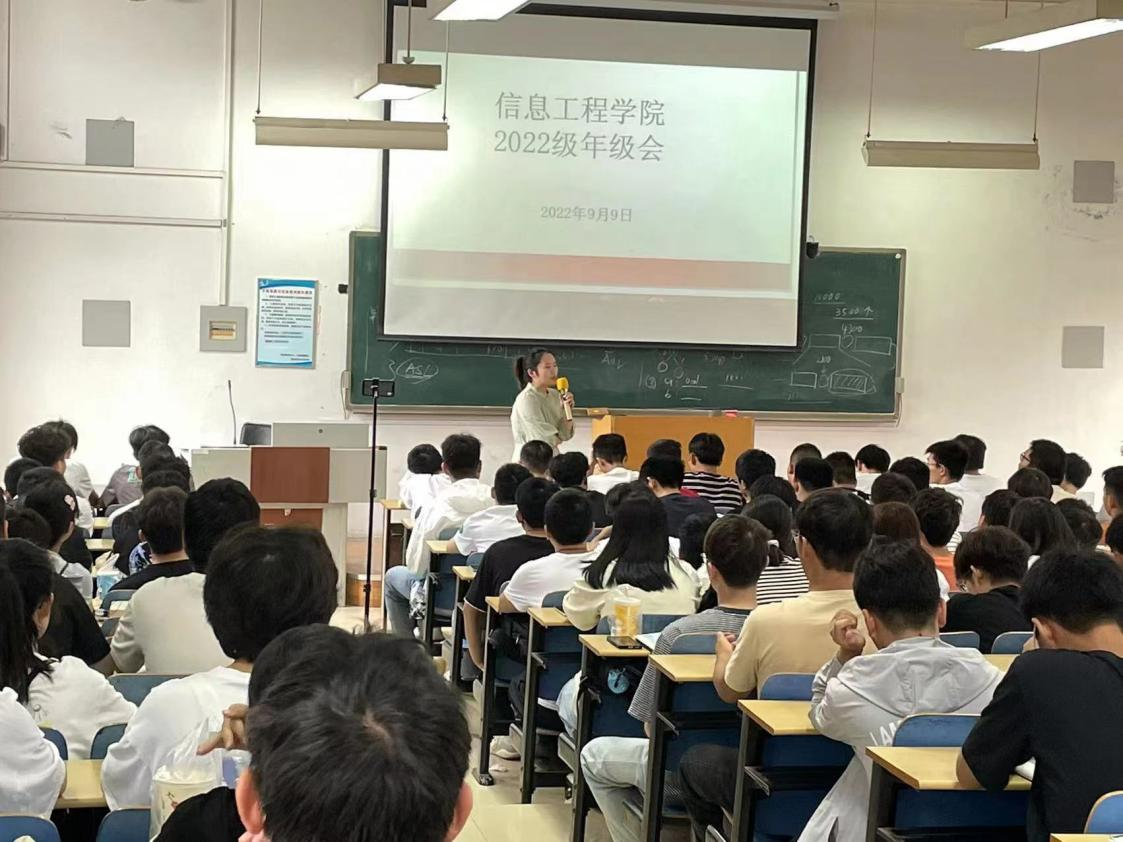 本网讯(特约记者/张露 学生记者/张莹)为了帮助新生更好地熟悉学校和学院的规章制度,尽快适应大学的学习与生活,信息工程学院于9月9日上午8点到12点,在14教304教室召开新生见面会,22级全体新生参与,鉴于疫情防控要求,会议分批开展,部分暂缓返校学生观看线上直播,会议由22级辅导员张露和关阳主持。